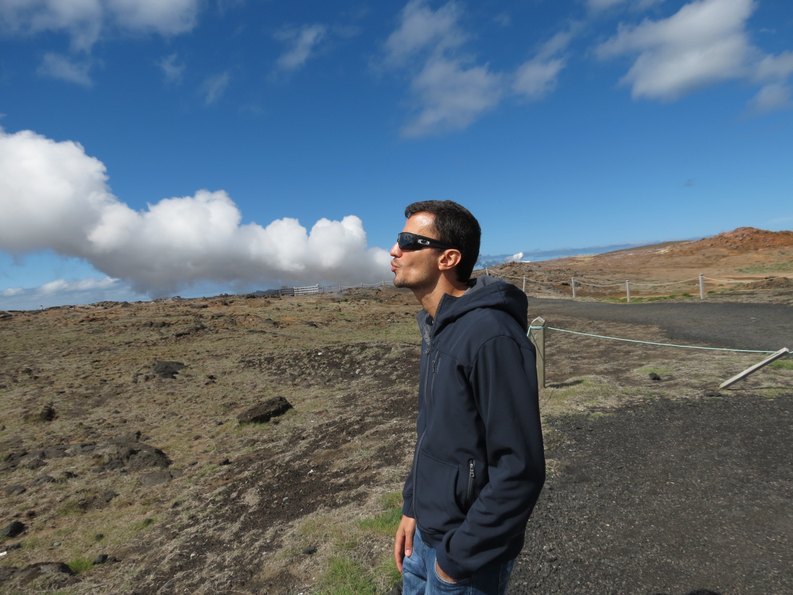 A primeira parada foi em Gunnuhver, uma pequena área geotermal que fica a 40 quilômetros do Aeroporto Internacional de Keflavik. Aqui, uma nuvem intermitente de vapor brota do solo e vai tomando várias formas e direções de acordo com a direção do vento. A brincadeira é passar por baixo da nuvem, e não tem como escapar, você sai molhado e com aquele cheirinho de ovo podre!